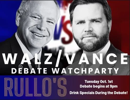 Join us for a Walz vs. Vance V.P. debate watchparty on the big screen at 9 p.m.! Drink specials during the debate!