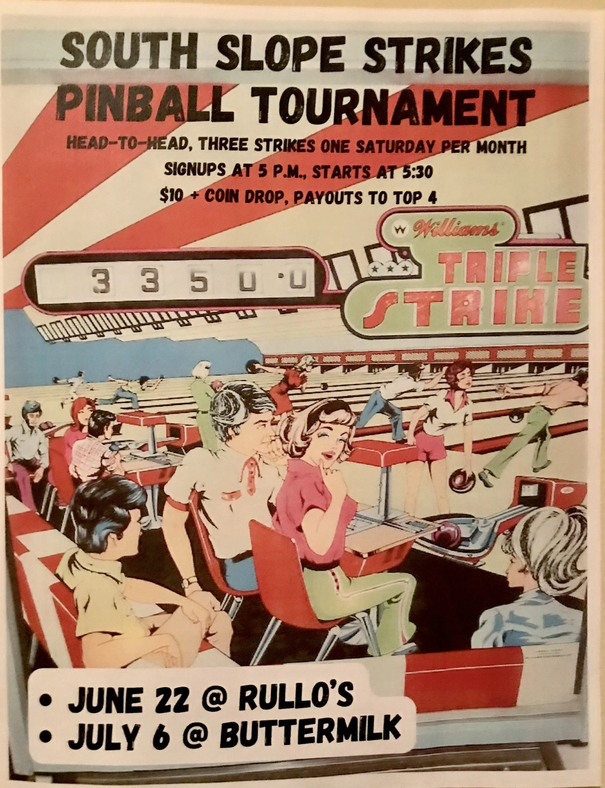 South Slope Strikes Pinball Tournament Saturday, June 22, 2024 5:00 PM 9:00 PM 17:00 21:00 Google Calendar ICS