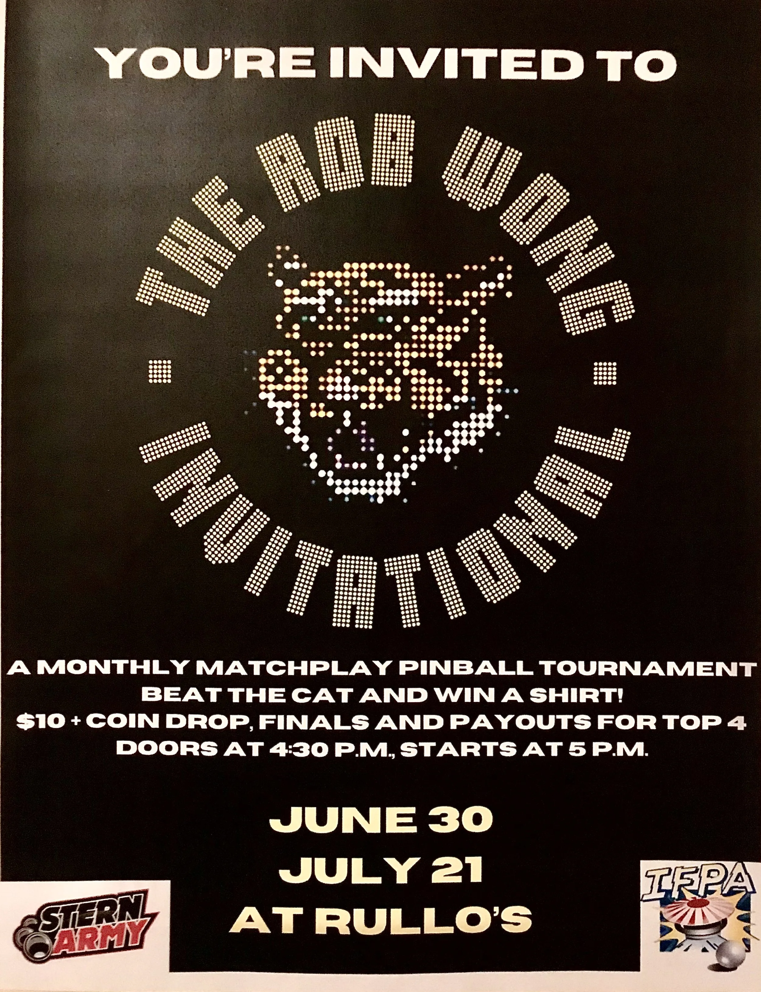 The Rob Wong Invitational: one of our exclusive monthly pinball tournaments! Win a shirt — and Bart might even take it right off his own back for you if you do! But you have to beat the cat @rhwong33! Amazing prizes each time. Thanks to @sternpinball for making us a part of the Stern Army.